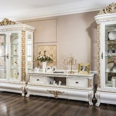 Гостиная Алсу 2+2 белый глянец - состоит из тв тумбы и двух двухстворчатой витрин, поистине королевская мебель созданная на фабрике ЭРА-Мебель. Алсу отличается максимально светлым тоном выкраски и глубокой золотой патиной.